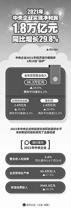 數(shù)據(jù)顯示,2021年,中央企業(yè)實現(xiàn)營業(yè)收入36.3萬億元,同比增長19.5%;實現(xiàn)利潤總額2.4萬億元,同比增長30.3%;實現(xiàn)凈利潤1.8萬億元,同比增長29.8%,均創(chuàng)歷史最好水平。中央企業(yè)全員勞動生產率人均達到69.4萬元,同比增長17.5%;百元營業(yè)收入支付的成本費用為94元,同比下降0.9元;年末資產負債率為64.9%,圓滿完成控制在65%以下的目標。