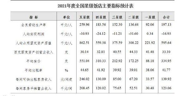 根據(jù)“2021年度全國星級飯店主要指標(biāo)統(tǒng)計(jì)表 ”,平均房價為334.95元,每間可供出租客房收入為139.92元/間夜,每間客房平攤營收為123.06千元/間。