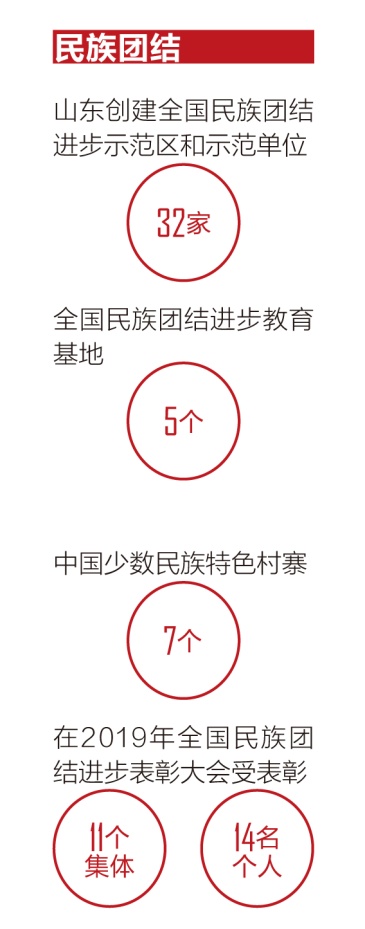在全國率先啟動民族團結(jié)進步和美家庭、示范崗位評選工作,營造爭先創(chuàng)優(yōu)氛圍。連續(xù)21年開展民族團結(jié)進步宣傳月活動,成為民族團結(jié)進步宣傳教育的特色品牌。實施城市民族工作“十有”示范社區(qū)建設(shè),開展城市民族工作“紅石榴”品牌創(chuàng)建活動,青島市、煙臺市、濟南市歷下區(qū)先后被國家民委確定為全國少數(shù)民族流動人口服務(wù)管理示范城市。截至目前,山東創(chuàng)建全國民族團結(jié)進步示范區(qū)和示范單位32家、全國民族團結(jié)進步教育基地5個、中國少數(shù)民族特色村寨7個,在2019年全國民族團結(jié)進步表彰大會上有11個集體和14名個人受到表彰。