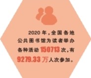 數(shù)據(jù)顯示,全國各級公共圖書館普遍開展講座、展覽、閱讀指導(dǎo)、讀書交流、演講誦讀等活動(dòng)。僅2020年,各地公共圖書館就為讀者舉辦各種活動(dòng)150713次,有9279.33萬人次參加。