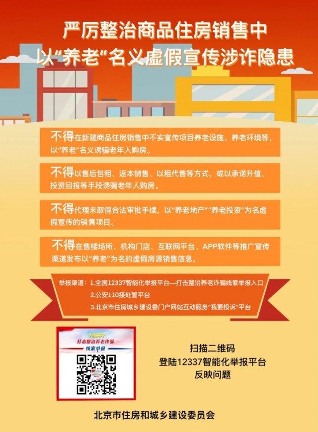 據(jù)“安居北京”公眾號消息,北京住建委發(fā)布提示,不得在新建商品住房銷售中不實宣傳項目養(yǎng)老設施、養(yǎng)老環(huán)境等,以“養(yǎng)老”名義誘騙老年人購房。不得以售后包租、返本銷售、以租代售等方式,或以承諾升值、投資回報等手段誘騙老年人購房。