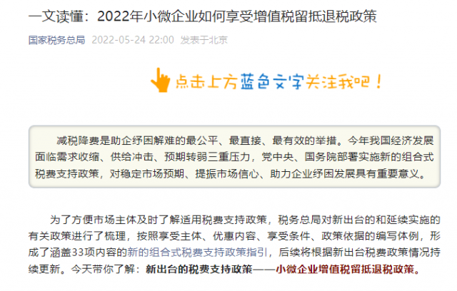 為了方便市場主體及時(shí)了解適用稅費(fèi)支持政策,稅務(wù)總局對新出臺的和延續(xù)實(shí)施的有關(guān)政策進(jìn)行了梳理,按照享受主體、優(yōu)惠內(nèi)容、享受條件、政策依據(jù)的編寫體例,形成了涵蓋33項(xiàng)內(nèi)容的新的組合式稅費(fèi)支持政策指引,后續(xù)將根據(jù)新出臺稅費(fèi)政策情況持續(xù)更新。今天帶你了解:新出臺的稅費(fèi)支持政策——小微企業(yè)增值稅留抵退稅政策。