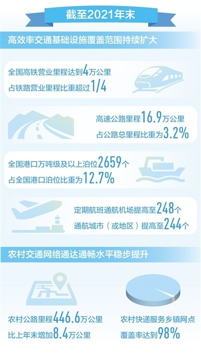 高效率交通基礎設施覆蓋范圍持續(xù)擴大。截至2021年末,全國高鐵營業(yè)里程達到4萬公里,占鐵路營業(yè)里程比重超過1/4。高速公路里程16.9萬公里,比上年末增加8090公里,占公路總里程比重為3.2%,呈現(xiàn)穩(wěn)步提高態(tài)勢。全國港口萬噸級及以上泊位2659個、增加67個,占全國港口泊位比重為12.7%、提高1個百分點。定期航班通航機場、通航城市(或地區(qū))分別提高至248個和244個。
