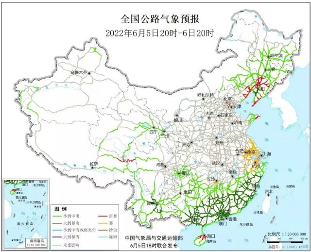 6月5日20時至6日20時,湖南南部、江西南部、浙江南部、福建大部、廣西南部和東部、廣東大部及云南中部、遼寧中部等地部分地區(qū)有大到暴雨,其中,湖南南部、廣西東北部、廣東西北部、福建西部等地部分地區(qū)有大暴雨。遼寧大部、山東東部、海南北部、西藏東北部等地局地有雷暴。另外,江蘇中南部、浙江中北部、安徽東部、湖南東部等地局地有霧。