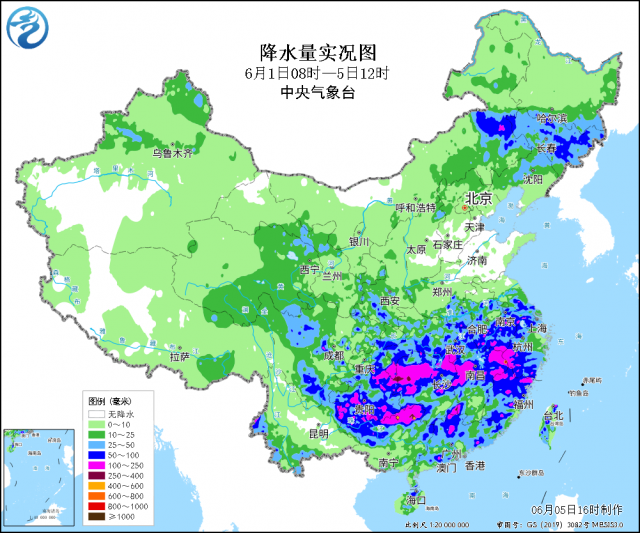 據(jù)統(tǒng)計(jì),截至6月5日上午,貴州銅仁、湖南懷化和湘西及廣西桂林、柳州、河池等地最大累計(jì)降雨量達(dá)350~593毫米,貴州、湖南、江西、浙江、廣西、廣東等地個(gè)別站點(diǎn)日雨量達(dá)到特大暴雨量級(250~326毫米);上述部分地區(qū)出現(xiàn)短時(shí)強(qiáng)降水(最大小時(shí)降雨量30~70毫米,局地80毫米以上)、雷暴大風(fēng)等強(qiáng)對流天氣。