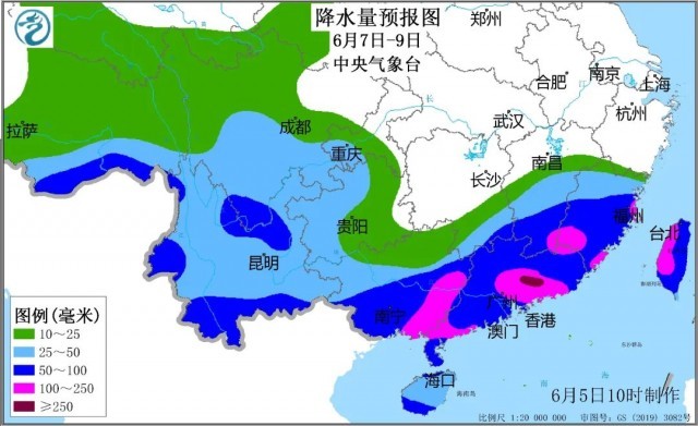 7日至9日,湖南南部、江西中南部、福建、廣西、廣東、海南、臺灣及四川中南部、云南、貴州西部等地部分地區(qū)將有大雨或暴雨,局地大暴雨。廣西東部、廣東西南部和中東部、福建西南部和東部沿海、臺灣西部等地部分地區(qū)降雨量可達(dá)100~180毫米,局地200~300毫米;上述地區(qū)還將伴有短時(shí)強(qiáng)降水(最大小時(shí)降雨量30~50毫米、局地70毫米以上)、雷暴大風(fēng)等強(qiáng)對流天氣。