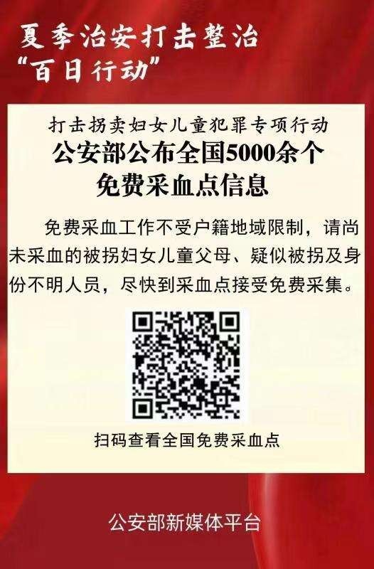 今年3月,公安部會(huì)同民政部、國家衛(wèi)健委、全國婦聯(lián)部署在全國組織開展新一輪打擊拐賣婦女兒童犯罪專項(xiàng)行動(dòng),“零容忍”打擊拐賣犯罪,在全社會(huì)形成強(qiáng)大震懾。為及時(shí)發(fā)現(xiàn)拐賣犯罪線索、最大程度便利有尋親需求人員就近采血,公安部在此前公布免費(fèi)采血點(diǎn)基礎(chǔ)上,通過梳理匯總、集中資源,將免費(fèi)采血點(diǎn)數(shù)量增至5000余個(gè),并通過多種平臺(tái)集中發(fā)布相關(guān)信息,進(jìn)一步擴(kuò)大免費(fèi)采血點(diǎn)覆蓋面,為縱深推進(jìn)專項(xiàng)行動(dòng)提供強(qiáng)有力的支撐。