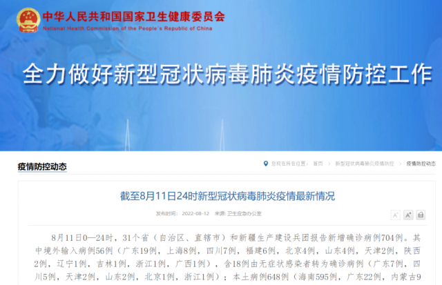8月11日0—24時,31個?。ㄗ灾螀^(qū)、直轄市)和新疆生產(chǎn)建設(shè)兵團報告新增確診病例704例。其中境外輸入病例56例(廣東19例,上海8例,四川7例,福建6例,北京4例,山東4例,天津2例,陜西2例,遼寧1例,吉林1例,浙江1例,廣西1例),含18例由無癥狀感染者轉(zhuǎn)為確診病例(廣東7例,四川5例,天津2例,山東2例,北京1例,浙江1例);本土病例648例(海南595例,廣東22例,內(nèi)蒙古9例,西藏7例,福建5例,上海2例,河南1例,重慶1例,四川1例,貴州1例,云南1例,陜西1例,甘肅1例,新疆1例),含11例由無癥狀感染者轉(zhuǎn)為確診病例(廣東7例,海南1例,四川1例,貴州1例,新疆1例)。無新增死亡病例。無新增疑似病例。