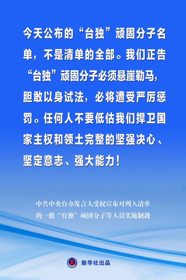 海報(bào)丨中共中央臺(tái)辦發(fā)言人受權(quán)宣布對(duì)列入清單的一批“臺(tái)獨(dú)”頑固分子等人員實(shí)施制裁
