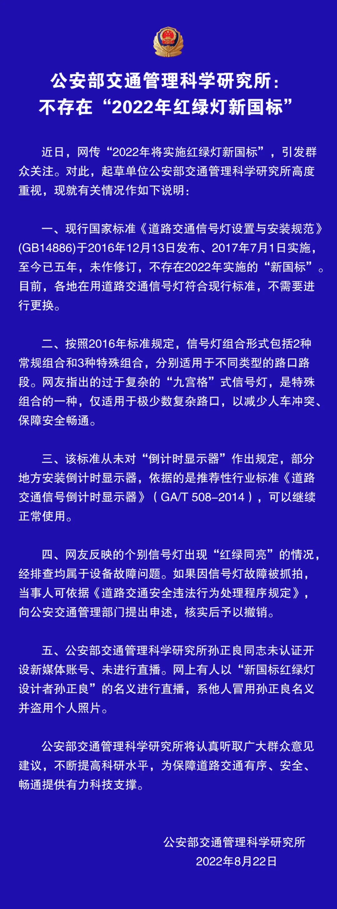 公安部交通管理科學(xué)研究所:不存在“2022年紅綠燈新國標(biāo)”!