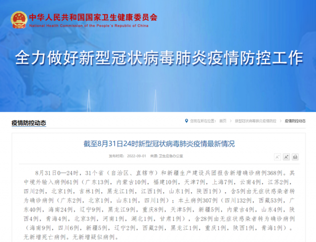 8月31日0—24時(shí),31個(gè)?。ㄗ灾螀^(qū)、直轄市)和新疆生產(chǎn)建設(shè)兵團(tuán)報(bào)告新增確診病例368例。其中境外輸入病例61例(廣東13例,內(nèi)蒙古10例,福建10例,天津7例,上海7例,云南4例,江蘇2例,四川2例,北京1例,吉林1例,黑龍江1例,江西1例,山東1例,陜西1例),含5例由無癥狀感染者轉(zhuǎn)為確診病例(廣東2例,北京1例,山東1例,四川1例);本土病例307例(四川132例,西藏53例,廣東40例,海南24例,遼寧9例,黑龍江9例,重慶8例,天津5例,新疆5例,內(nèi)蒙古4例,山東4例,陜西4例,青海4例,北京3例,河南1例,湖北1例,甘肅1例),含28例由無癥狀感染者轉(zhuǎn)為確診病例(海南9例,四川6例,新疆5例,遼寧2例,西藏2例,黑龍江1例,重慶1例,陜西1例,青海1例)。無新增死亡病例。無新增疑似病例。