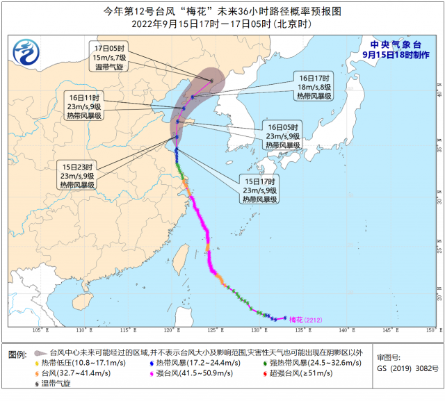 據(jù)中央氣象臺(tái)9月15日18時(shí)消息,“梅花”目前在黃海南部海面上,將于今天(9月15日)夜間在山東黃島至海陽一帶再次登陸(熱帶風(fēng)暴級,18-23米/秒,8-9級),并將于明天(9月16日)早晨移入渤海海峽,明天傍晚前后將在遼寧旅順至莊河一帶沿海再次登陸(熱帶風(fēng)暴級,18-23米/秒,8-9級),之后逐漸變性為溫帶氣旋 。