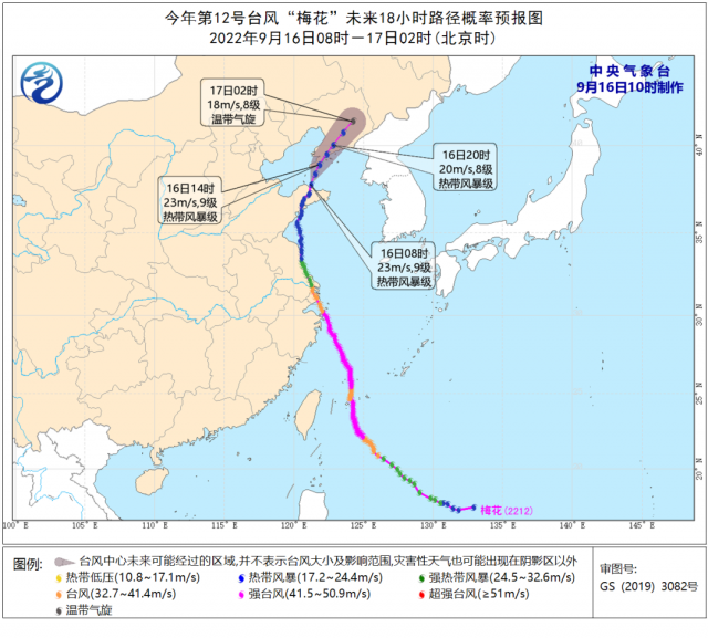 臺風“梅花”未來24小時路徑概率預報圖(2022年9月16日8時至17日2時) 來源:中央氣象臺