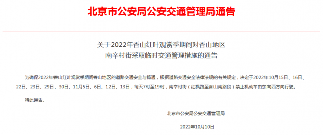 北京市交管局網(wǎng)站發(fā)布通告,為確保今年香山紅葉觀賞季期間的道路交通安全與暢通,10月15日、16日、22日、23日、29日、30日、11月5日、6日、12日、13日,每天7時至19時,南辛村街(紅楓路至香山南路段)禁止機(jī)動車由東向西方向行駛。