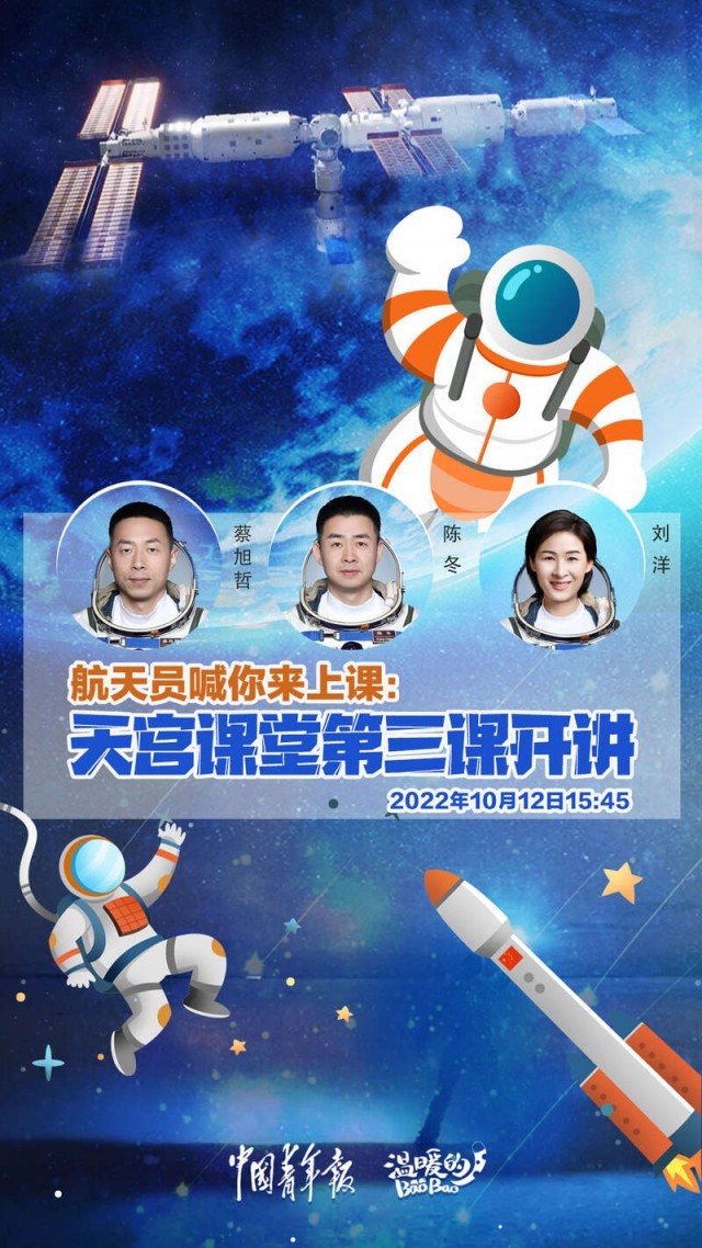 中國(guó)青年報(bào)客戶端北京10月12日電(中青報(bào)·中青網(wǎng)記者 邱晨輝)據(jù)中國(guó)載人航天工程辦公室消息,北京時(shí)間2022年10月12日16時(shí)01分,“天宮課堂”第三課在中國(guó)空間站開講,新晉“太空教師”陳冬、劉洋、蔡旭哲為廣大青少年帶來一場(chǎng)精彩的太空科普課,這是中國(guó)航天員首次在問天實(shí)驗(yàn)艙內(nèi)進(jìn)行授課。