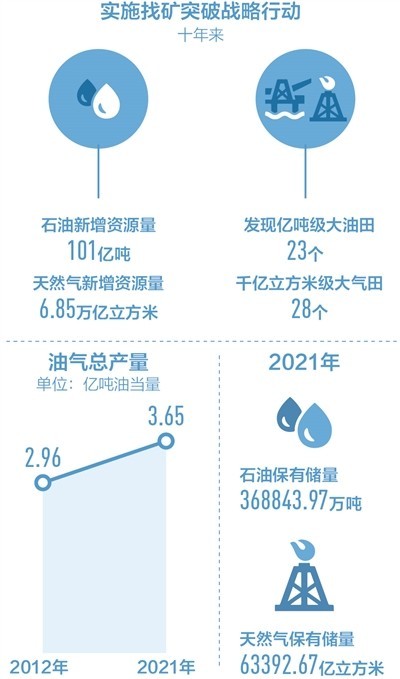 黨的十八大以來,我國油氣勘探開發(fā)力度不斷加大,高質量發(fā)展體系日趨完善。油氣總產量由2012年的2.96億噸油當量增長至2021年的3.65億噸油當量。今年前9月,原油產量達15375萬噸,同比增長3.0%;天然氣產量達1601億立方米,同比增長5.4%。