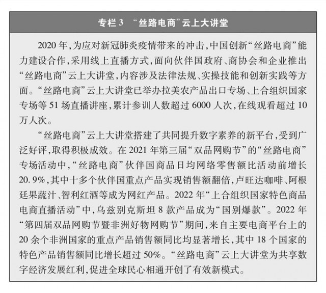 “絲路電商”合作成果豐碩。自2016年以來,中國與五大洲23個國家建立雙邊電子商務(wù)合作機(jī)制,建立中國-中東歐國家、中國-中亞五國電子商務(wù)合作對話機(jī)制,通過政企對話、聯(lián)合研究、能力建設(shè)等推動多層次交流合作,營造良好發(fā)展環(huán)境,構(gòu)建數(shù)字合作格局。電子商務(wù)企業(yè)加速“出?!?,帶動跨境物流、移動支付等各領(lǐng)域?qū)崿F(xiàn)全球發(fā)展。積極參與世界貿(mào)易組織、二十國集團(tuán)、亞太經(jīng)合組織、金磚國家、上合組織等多邊和區(qū)域貿(mào)易機(jī)制下的電子商務(wù)議題討論,與自貿(mào)伙伴共同構(gòu)建高水平數(shù)字經(jīng)濟(jì)規(guī)則。電子商務(wù)國際規(guī)則構(gòu)建取得突破,區(qū)域全面經(jīng)濟(jì)伙伴關(guān)系協(xié)定電子商務(wù)章節(jié)成為目前覆蓋區(qū)域最廣、內(nèi)容全面、水平較高的電子商務(wù)國際規(guī)則。