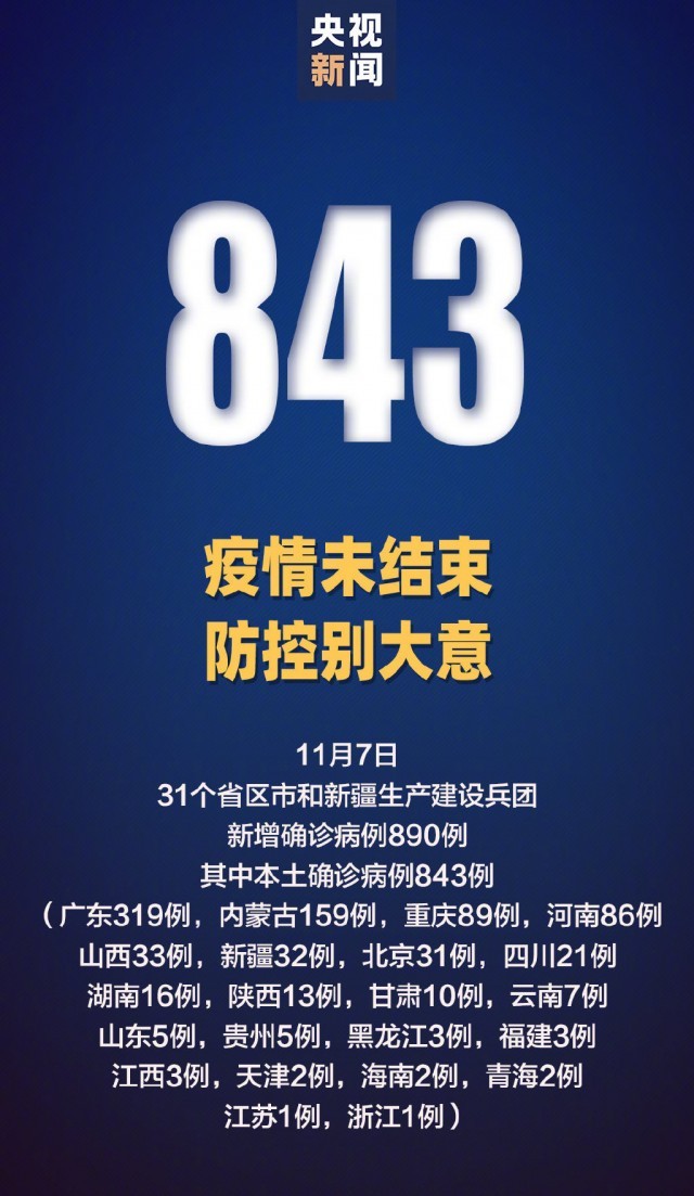 11月7日0—24時,31個?。ㄗ灾螀^(qū)、直轄市)和新疆生產(chǎn)建設兵團報告新增確診病例890例。其中境外輸入病例47例(福建12例,廣東12例,四川8例,北京5例,天津3例,上海3例,遼寧2例,江蘇1例,山東1例),含2例由無癥狀感染者轉為確診病例(廣東1例,四川1例);本土病例843例(廣東319例,內蒙古159例,重慶89例,河南86例,山西33例,新疆32例,北京31例,四川21例,湖南16例,陜西13例,甘肅10例,云南7例,山東5例,貴州5例,黑龍江3例,福建3例,江西3例,天津2例,海南2例,青海2例,江蘇1例,浙江1例),含152例由無癥狀感染者轉為確診病例(廣東121例,甘肅9例,四川7例,北京3例,重慶3例,福建2例,湖南2例,陜西2例,山西1例,黑龍江1例,浙江1例)。無新增死亡病例。無新增疑似病例。