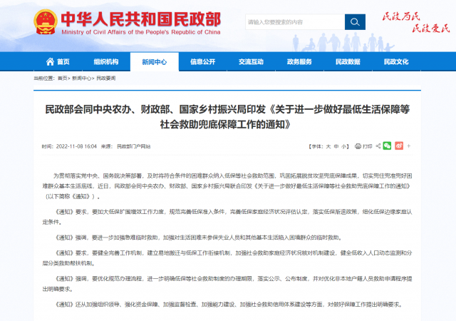 據(jù)民政部網(wǎng)站消息,為貫徹落實黨中央、國務(wù)院決策部署,及時將符合條件的困難群眾納入低保等社會救助范圍,鞏固拓展脫貧攻堅兜底保障成果,切實兜住兜準(zhǔn)兜好困難群眾基本生活底線,近日,民政部會同中央農(nóng)辦、財政部、國家鄉(xiāng)村振興局聯(lián)合印發(fā)《關(guān)于進一步做好最低生活保障等社會救助兜底保障工作的通知》(以下簡稱《通知》)。