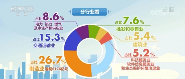 數(shù)據(jù)顯示,分行業(yè)看,制造業(yè)是受益最明顯的行業(yè),退稅6176億元,占比26.7%;交通運輸業(yè)占15.3%;電力、熱力、燃氣及水生產和供應業(yè)、批發(fā)和零售業(yè)、建筑業(yè)、科技服務業(yè)、軟件信息服務業(yè)和生態(tài)保護環(huán)境治理業(yè)占比從8.6%到5.2%不等。