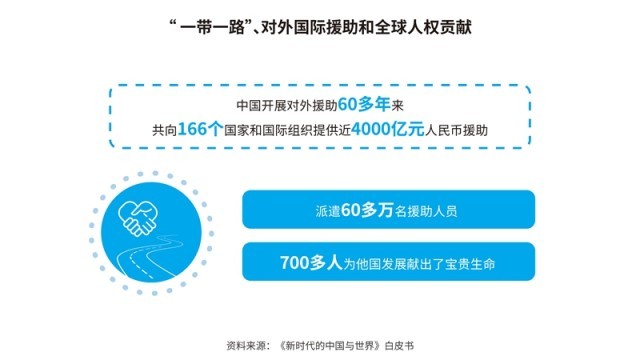 中國先后批準(zhǔn)或加入了30余項國際人權(quán)文書,其中包括6項聯(lián)合國核心人權(quán)條約;累計共向166個國家和國際組織提供了援助,派遣60多萬名援助人員;多次無條件免除重債窮國和最不發(fā)達(dá)國家對華到期政府無息貸款債務(wù)。在聯(lián)合國維和行動中,中國是安理會常任理事國第一大出兵國,30多年來累計派出維和官兵5萬余人次。共建“一帶一路”已成為助力各國發(fā)展、深受世界歡迎的新興國際公共產(chǎn)品,據(jù)世界銀行研究報告,到2030年,將使相關(guān)國家760萬人擺脫極端貧困、3200萬人擺脫中度貧困。新冠肺炎疫情暴發(fā)以來,中國努力促進(jìn)新冠疫苗在全球范圍內(nèi)公平合理分配,成為全球?qū)ν馓峁┮呙鐢?shù)量最多的國家。