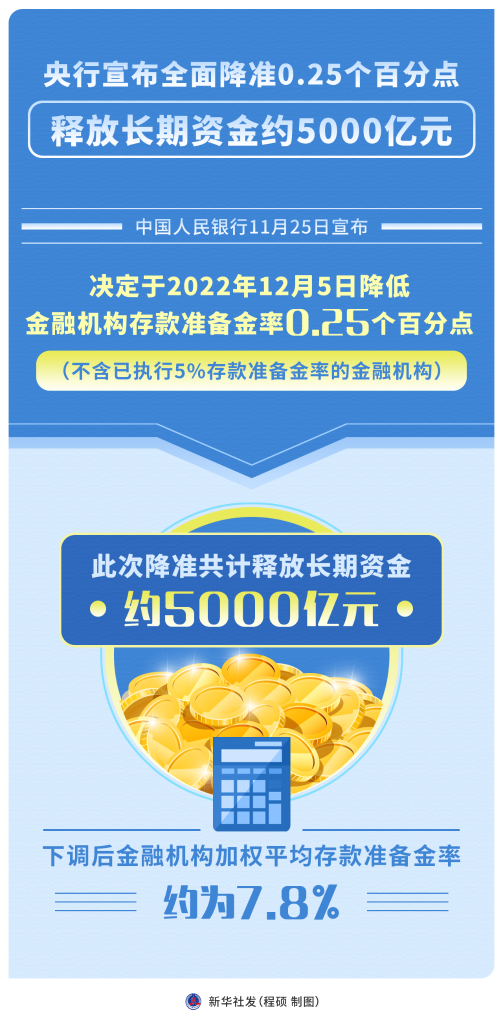 11月25日中國人民銀行宣布,決定于2022年12月5日降低金融機構存款準備金率0.25個百分點(不含已執(zhí)行5%存款準備金率的金融機構)。這是年內(nèi)第二次降準,今年首次降準已在4月落地。兩次降準共降低金融機構存款準備金率0.5個百分點、釋放長期資金超萬億元,金融機構加權平均存款準備金率降至約7.8%。