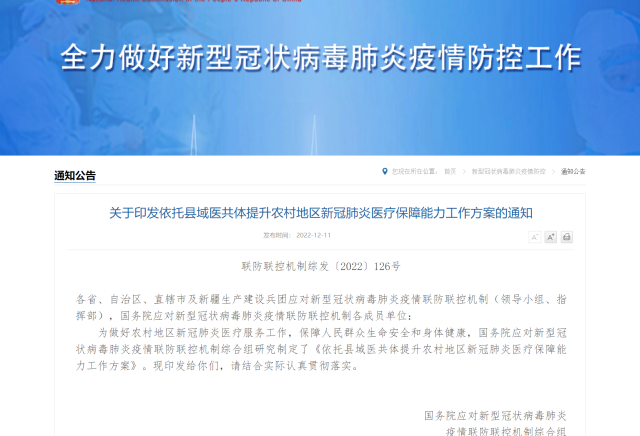 為做好農(nóng)村地區(qū)新冠肺炎醫(yī)療服務(wù)工作,保障高齡合并基礎(chǔ)疾病等重癥風(fēng)險(xiǎn)較高的感染者及時(shí)救治,在農(nóng)村地區(qū),以縣域醫(yī)共體為載體,提升縣級(jí)醫(yī)院重癥救治能力,發(fā)揮鄉(xiāng)鎮(zhèn)衛(wèi)生院和村衛(wèi)生室健康監(jiān)測(cè)作用,最大可能降低重癥率、病亡率,國(guó)務(wù)院聯(lián)防聯(lián)控機(jī)制11日發(fā)布《關(guān)于印發(fā)依托縣域醫(yī)共體提升農(nóng)村地區(qū)新冠肺炎醫(yī)療保障能力工作方案的通知》(下稱“方案”)。