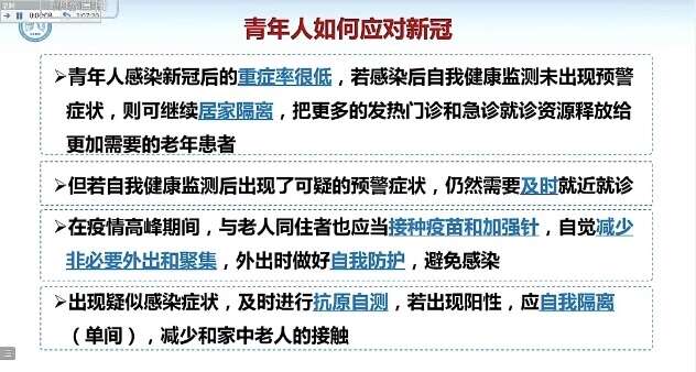青年人如何應(yīng)對新冠?鐘南山說,青年人感染新冠后的重癥率非常低,如果感染,建議居家隔離,把更多的發(fā)熱門診和急診資源釋放給更加需要的老年患者。如果自我監(jiān)測后出現(xiàn)了可疑的癥狀,仍然需要及時就近就診。在疫情高峰期,與老人同住者也應(yīng)當(dāng)接種疫苗和加強針,自覺減少非必要外出和聚集,外出時做好自我防護,避免感染。他說,“我的外孫女前幾天得了,3天就恢復(fù)了?!?/p>