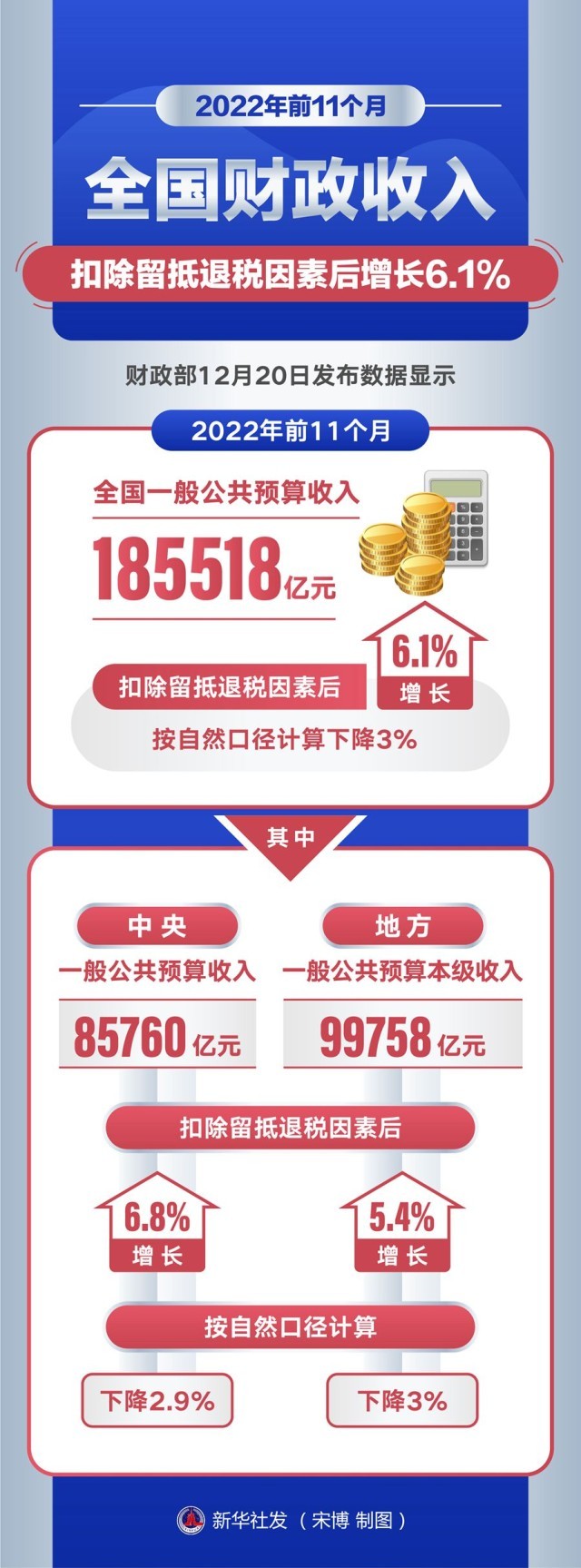 前11個(gè)月全國(guó)財(cái)政收入扣除留抵退稅因素后增長(zhǎng)6.1%