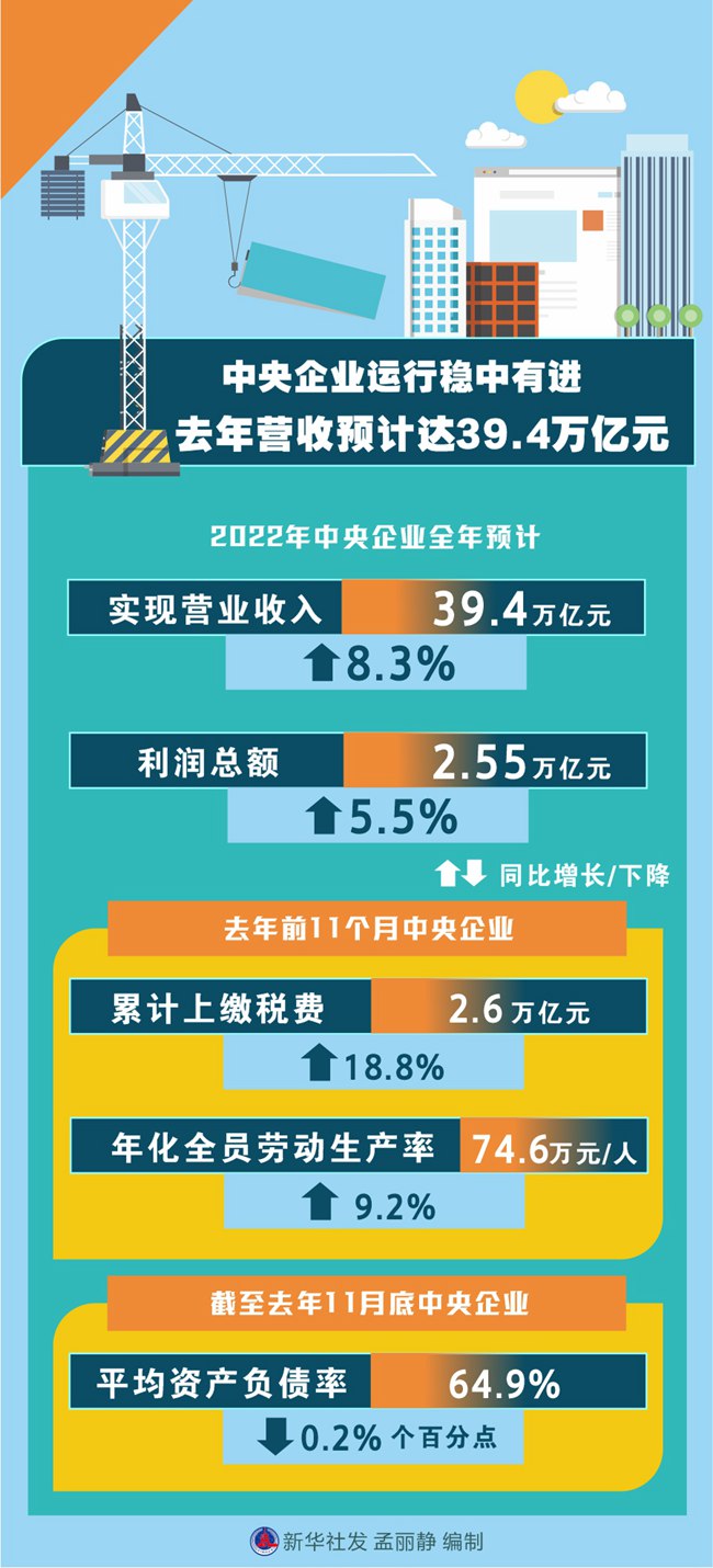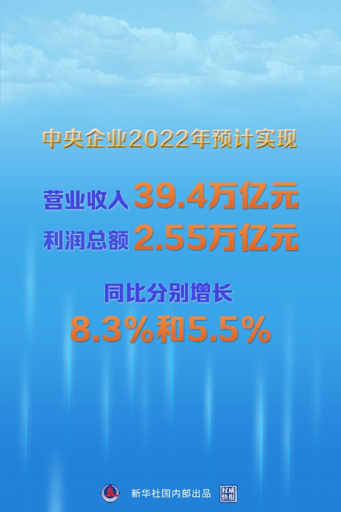 新華社北京1月5日電(記者王希)2022年,國資央企統(tǒng)籌疫情防控和企業(yè)生產(chǎn)經(jīng)營,統(tǒng)籌發(fā)展和安全,推動經(jīng)濟運行實現(xiàn)穩(wěn)中有進,中央企業(yè)全年預(yù)計實現(xiàn)營業(yè)收入39.4萬億元、利潤總額2.55萬億元,同比分別增長8.3%和5.5%。