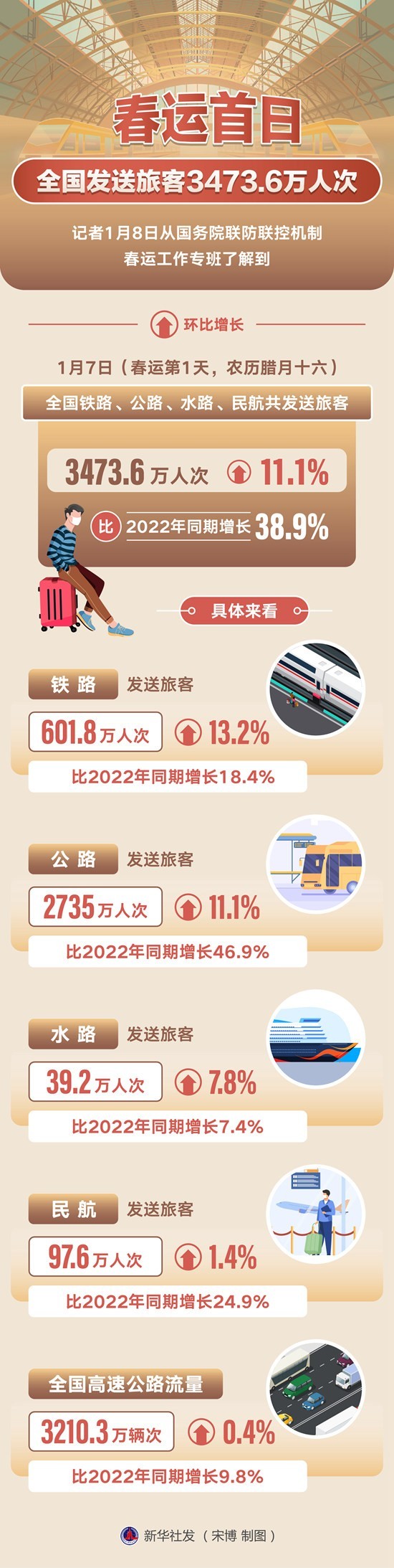 記者1月8日從國(guó)務(wù)院聯(lián)防聯(lián)控機(jī)制春運(yùn)工作專班了解到,1月7日(春運(yùn)第1天,農(nóng)歷臘月十六)全國(guó)鐵路、公路、水路、民航共發(fā)送旅客3473.6萬(wàn)人次,環(huán)比增長(zhǎng)11.1%,比2022年同期增長(zhǎng)38.9%。宋博/制圖(新華社發(fā))