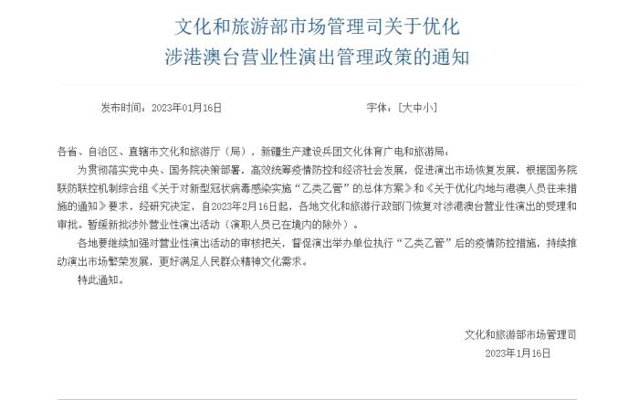 《通知》提到,根據(jù)國務(wù)院聯(lián)防聯(lián)控機制綜合組《關(guān)于對新型冠狀病毒感染實施“乙類乙管”的總體方案》和《關(guān)于優(yōu)化內(nèi)地與港澳人員往來措施的通知》要求,經(jīng)研究決定,自2023年2月16日起,各地文化和旅游行政部門恢復(fù)對涉港澳臺營業(yè)性演出的受理和審批。暫緩新批涉外營業(yè)性演出活動(演職人員已在境內(nèi)的除外)。