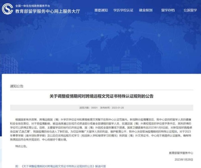 中國青年報客戶端北京1月29日電(中青報·中青網(wǎng)記者 葉雨婷)記者從教育部留學(xué)服務(wù)中心(以下簡稱“中心”)官方網(wǎng)站獲悉,1月28日,中心發(fā)布《關(guān)于調(diào)整疫情期間對跨境遠程文憑證書特殊認證規(guī)則的公告》指出,對于2023年春季學(xué)期(南半球秋季學(xué)期)及以后仍采用遠程方式學(xué)習(xí)(包括新入學(xué)和繼續(xù)學(xué)習(xí)的情況)所獲國(境)外文憑證書,中心將不再提供認證服務(wù)。