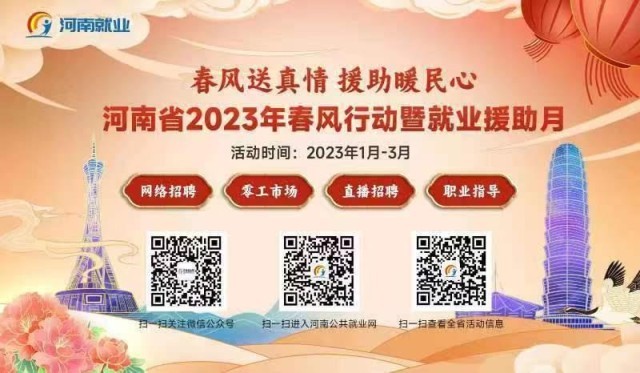 河南省通過“1+6省際勞務(wù)協(xié)作聯(lián)盟”平臺鋪路、省級專場活動高位引領(lǐng)、“四進(jìn)”就業(yè)援助服務(wù)保障、線下線上同步直播送崗、零工市場全省聯(lián)動快招等形式,把就業(yè)春風(fēng)送到群眾身邊?;顒悠陂g,計劃組織1.6萬家企業(yè),舉辦2500場招聘活動,發(fā)布100萬崗位。