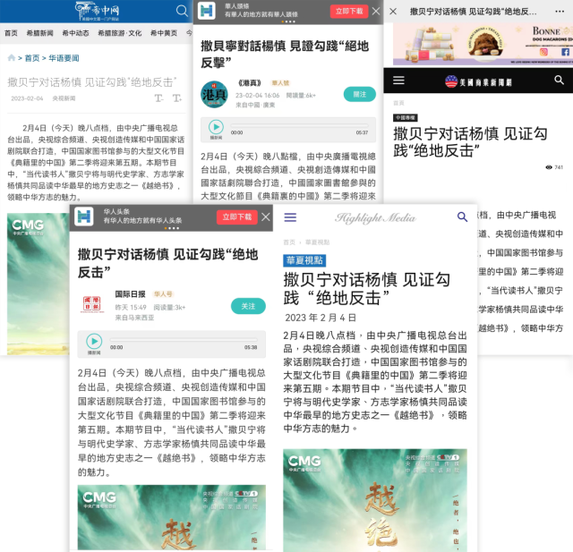 未播先熱!這部當(dāng)代人幾乎聞所未聞的千古“奇書”,一下子吸引了海內(nèi)外網(wǎng)民目光。海內(nèi)外諸多媒體迅速關(guān)注,紛紛報道。截至目前,歐洲華語廣播電臺、匈牙利聯(lián)合報、北歐時報等數(shù)十家海外媒體對第二季內(nèi)容的轉(zhuǎn)發(fā)和報道,已輻射10多個國家和地區(qū),在海外再次掀起“典籍熱”。