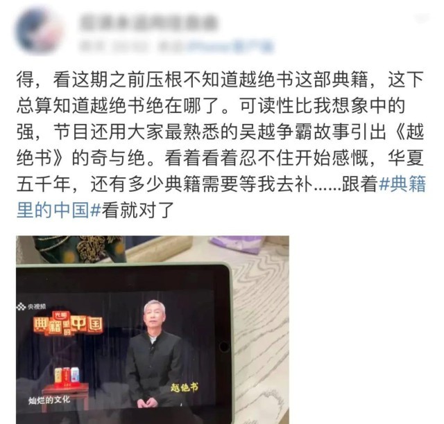 大學(xué)時讀的這部書,令總臺臺長記憶深刻。在提議策劃推出《典籍里的中國》第二季時,臺長建議關(guān)注《越絕書》這個選題。古越人絕地求生、奮斗不息的精神,值得今人傳承弘揚!