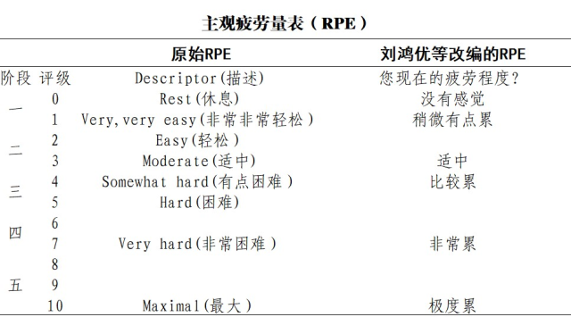 使用主觀疲勞感知評(píng)估量表,作為逐步提高活動(dòng)水平的指南。該量表是世界衛(wèi)生組織在《新冠病毒相關(guān)疾病康復(fù)指導(dǎo)手冊(cè)》對(duì)感染后患者通過記錄日?;顒?dòng)以及主觀疲勞量表評(píng)分(RPE值)來(lái)監(jiān)控自身的狀況,并用于指導(dǎo)如何提高自身活動(dòng)水平的量表。該量表將運(yùn)動(dòng)中主觀感受的費(fèi)力程度劃分為0分(完全不費(fèi)力)到10分(最大程度的用力),即RPE值0~10分。
