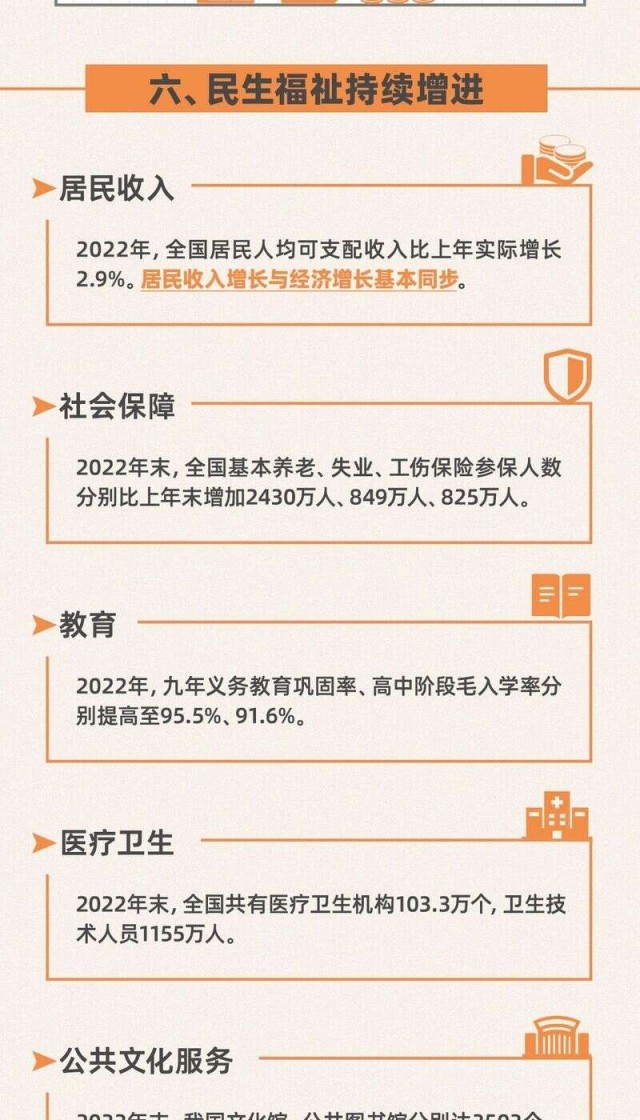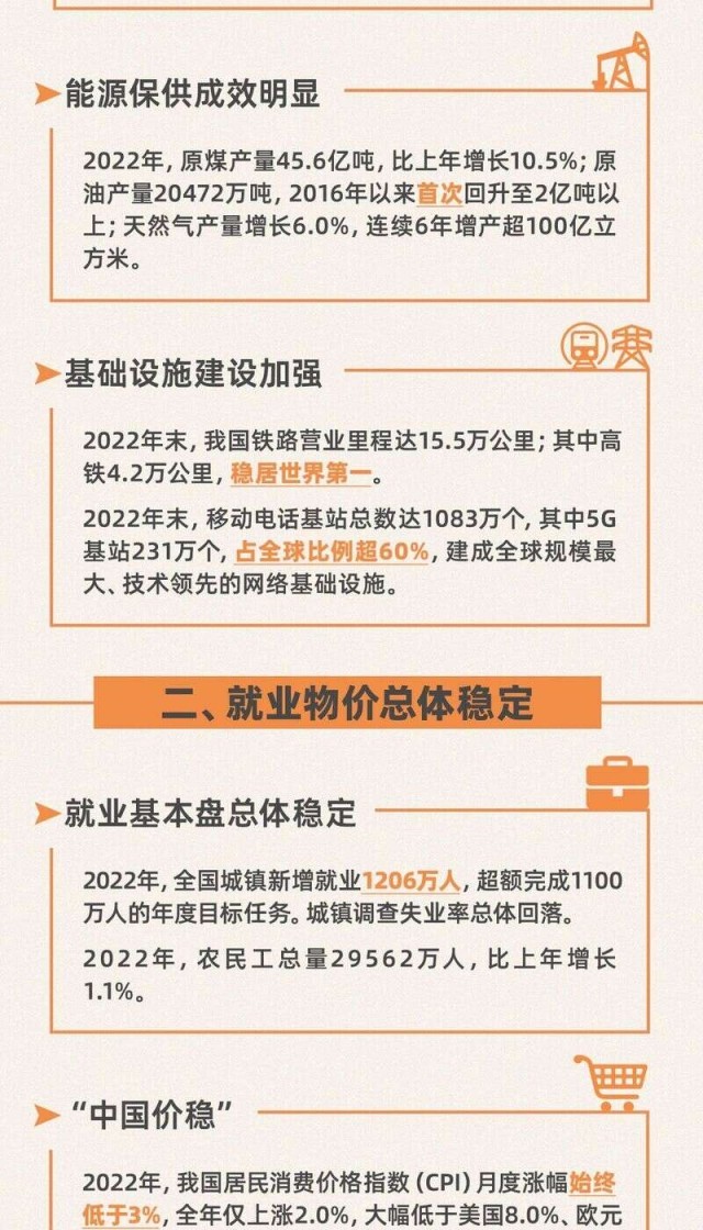 今日,國(guó)家統(tǒng)計(jì)局發(fā)布2022年國(guó)民經(jīng)濟(jì)和社會(huì)發(fā)展統(tǒng)計(jì)公報(bào)。初步核算,經(jīng)濟(jì)總量突破120萬(wàn)億元,再上新臺(tái)階;全年糧食產(chǎn)量連續(xù)8年穩(wěn)定在1.3萬(wàn)億斤以上;全部工業(yè)增加值首次超過(guò)40萬(wàn)億元;全國(guó)城鎮(zhèn)新增就業(yè)1206萬(wàn)人,超額完成年度目標(biāo)任務(wù);CPI月度漲幅始終低于3%;貨物進(jìn)出口總額首次突破40萬(wàn)億元大關(guān);引資規(guī)模再創(chuàng)新高;全國(guó)居民人均可支配收入實(shí)際增長(zhǎng)2.9%......轉(zhuǎn)存圖解,看看這些數(shù)字背后2022年的中國(guó)。