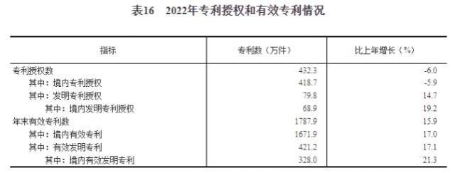 全年授予專利權(quán)432.3萬件,比上年下降6.0%;PCT專利申請受理量7.4萬件。截至年末,有效專利1787.9萬件,其中境內(nèi)有效發(fā)明專利328.0萬件。每萬人口高價值發(fā)明專利擁有量9.4件。全年商標(biāo)注冊617.7萬件,比上年下降20.2%。全年共簽訂技術(shù)合同77萬項,技術(shù)合同成交金額47791億元,比上年增長28.2%。我國公民具備科學(xué)素質(zhì)的比例達到12.93%。