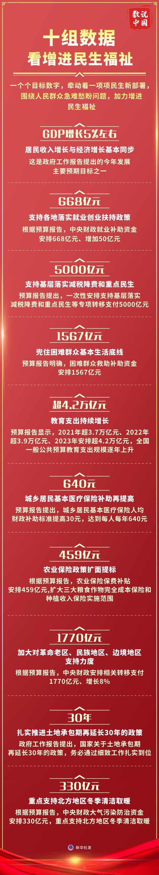 翻開5日提請(qǐng)第十四屆全國人民代表大會(huì)第一次會(huì)議審議的政府工作報(bào)告和提請(qǐng)審查的計(jì)劃報(bào)告、預(yù)算報(bào)告,一個(gè)個(gè)目標(biāo)數(shù)字,牽動(dòng)著一項(xiàng)項(xiàng)民生新部署,圍繞人民群眾急難愁盼問題,加力增進(jìn)民生福祉。