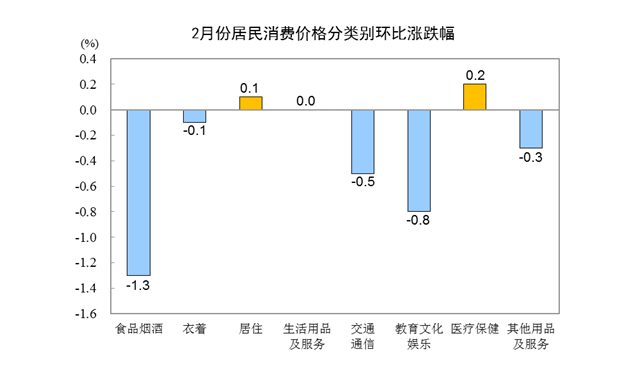 2月份,全國居民消費價格環(huán)比下降0.5%。其中,城市下降0.5%,農(nóng)村下降0.5%;食品價格下降2.0%,非食品價格下降0.2%;消費品價格下降0.6%,服務(wù)價格下降0.4%。