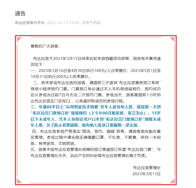央視網(wǎng)消息:據(jù)布達(dá)拉宮官方平臺微信公眾號消息,布達(dá)拉宮于2023年3月15日結(jié)束此輪冬游西藏活動(dòng)政策,現(xiàn)將有關(guān)事項(xiàng)通告如下: