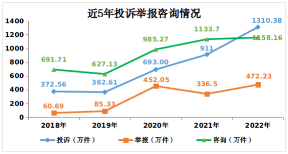 消費(fèi)者積極發(fā)揮社會(huì)監(jiān)督作用,2022年全年向市場監(jiān)管部門舉報(bào)各類違法線索472.23萬件,同比增長40.34%。