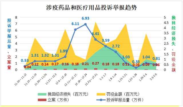 “二十條”和“新十條”出臺(tái)后,疫情防控重心從防控感染轉(zhuǎn)到醫(yī)療救治,2022年11月10日至2022年底,全國12315平臺(tái)接收相關(guān)投訴舉報(bào)24.11萬件,同比增長3.88倍,環(huán)比增長2.95倍,最高峰值達(dá)到19.5倍。其中,投訴14.18萬件,舉報(bào)9.93萬件,挽回經(jīng)濟(jì)損失498.17萬元。