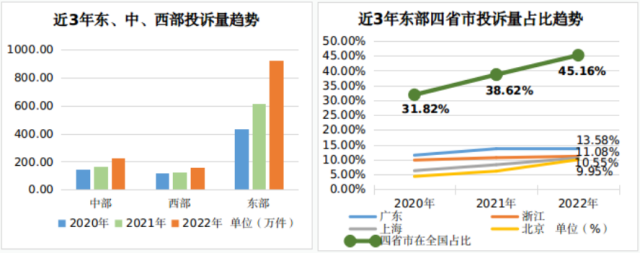 從近三年趨勢看,廣東、浙江、上海、北京4個(gè)省市的消費(fèi)正在加速集聚。消費(fèi)投訴數(shù)量與消費(fèi)活躍水平呈正相關(guān)關(guān)系,四省市消費(fèi)投訴數(shù)量在全國的占比從2020年的31.8%增長到2022年的45.16%。