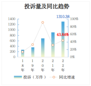 2022年,全國市場監(jiān)管部門受理消費(fèi)者投訴1310.38萬件,同比增長43.84%,增速較2021年有所放大。其中,售后服務(wù)問題增長最快,群眾反映最強(qiáng)烈,同比增長57.67%。消費(fèi)者訴求主要集中在不退款、不發(fā)貨、不履行“三包”承諾、不落實(shí)七天無理由退貨義務(wù)、送貨不及時(shí)等方面。