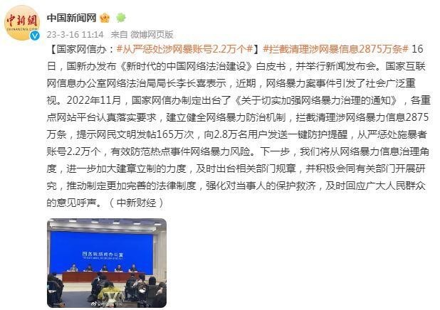 國家網(wǎng)信辦:攔截清理涉網(wǎng)絡(luò)暴力信息2875萬條,從嚴懲處涉網(wǎng)暴賬號2.2萬個