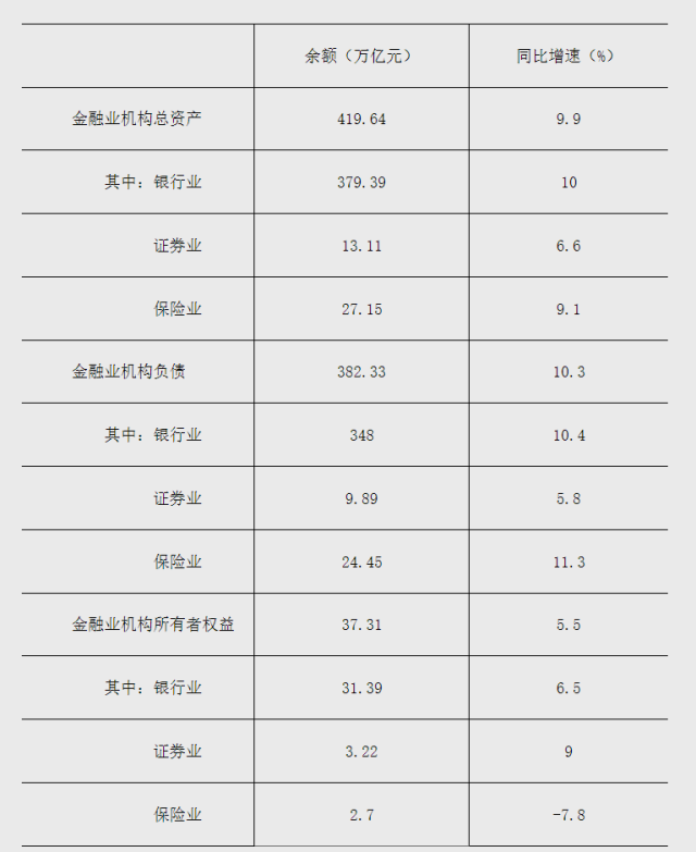金融業(yè)機(jī)構(gòu)負(fù)債為382.33萬億元,同比增長10.3%,其中,銀行業(yè)機(jī)構(gòu)負(fù)債為348萬億元,同比增長10.4%;證券業(yè)機(jī)構(gòu)負(fù)債為9.89萬億元,同比增長5.8%;保險業(yè)機(jī)構(gòu)負(fù)債為24.45萬億元,同比增長11.3%。