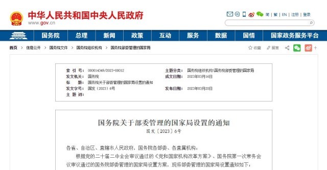 央視網(wǎng)消息:3月20日,《國務(wù)院關(guān)于部委管理的國家局設(shè)置的通知》發(fā)布。具體如下: