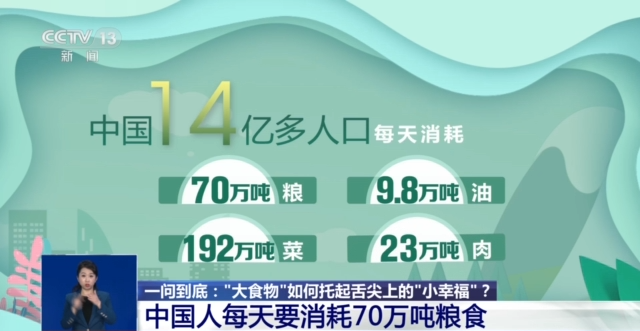 中國(guó)農(nóng)業(yè)科學(xué)院研究員 國(guó)家食物與營(yíng)養(yǎng)咨詢委員會(huì)主任 陳萌山:過(guò)去我們吃飯,主要是主糧,一大碗米飯或者一點(diǎn)咸菜,一點(diǎn)辣椒。那么現(xiàn)在不一樣了,我們一小碗米飯很多菜,不僅僅是主食,副食老百姓要求更高。我們講直接消費(fèi)的口糧,已經(jīng)由1978年的人均248公斤,下降到目前的130公斤,所以副食也成為主食了。為了適應(yīng)這樣一個(gè)新的形勢(shì),總書(shū)記提出“大食物觀”。